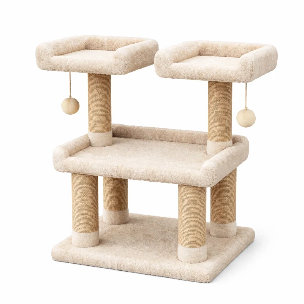Arbre à chat en sisal et tissu peluche beige avec jouets suspendus