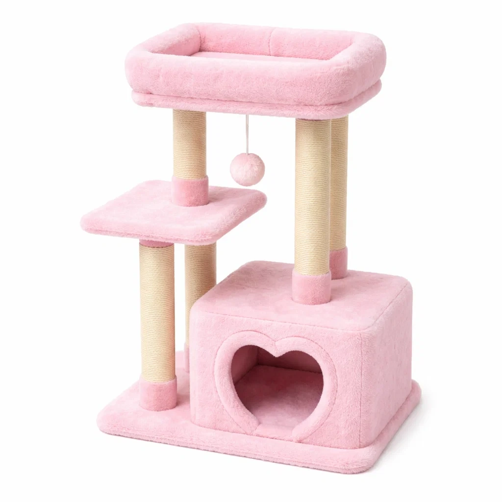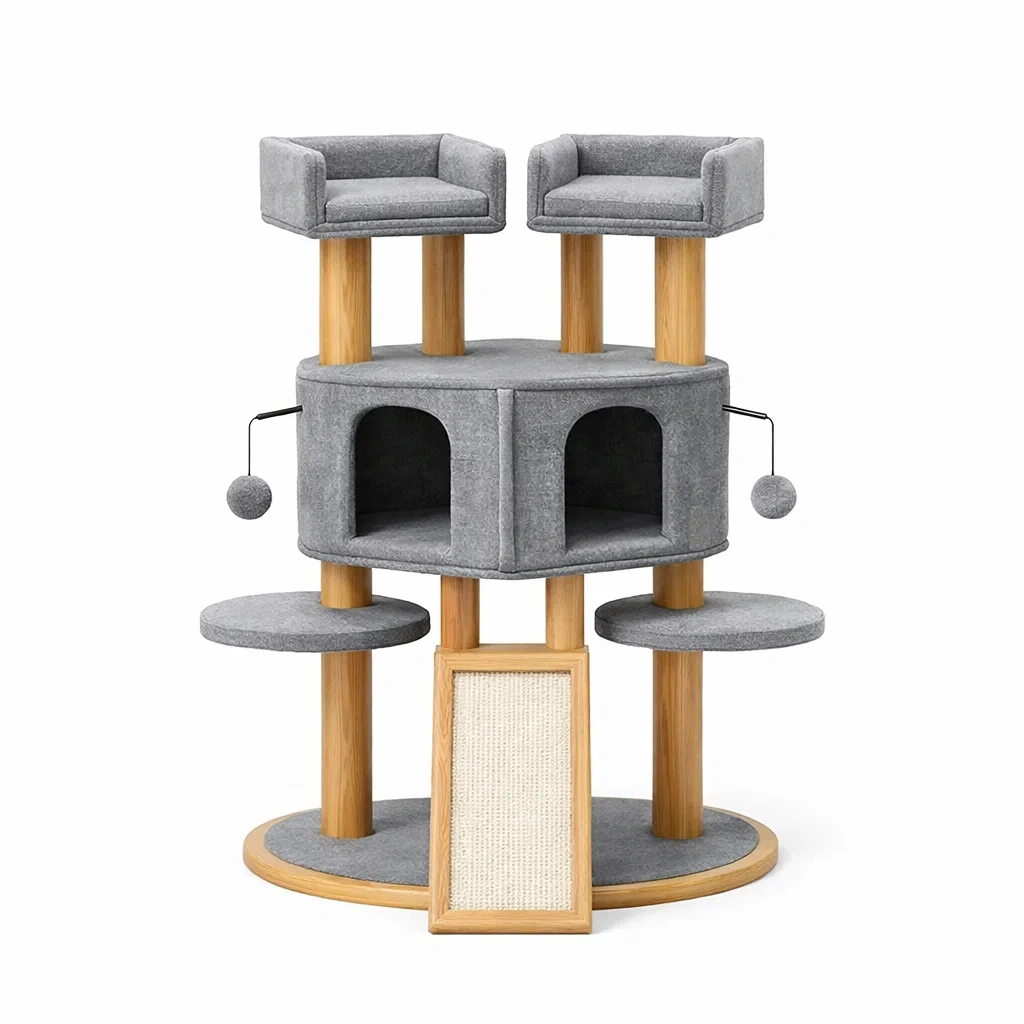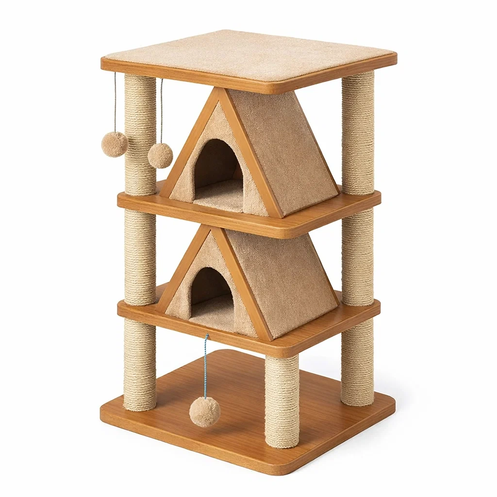 Arbre à chat en bois avec niches triangulaires et colonnes en sisal