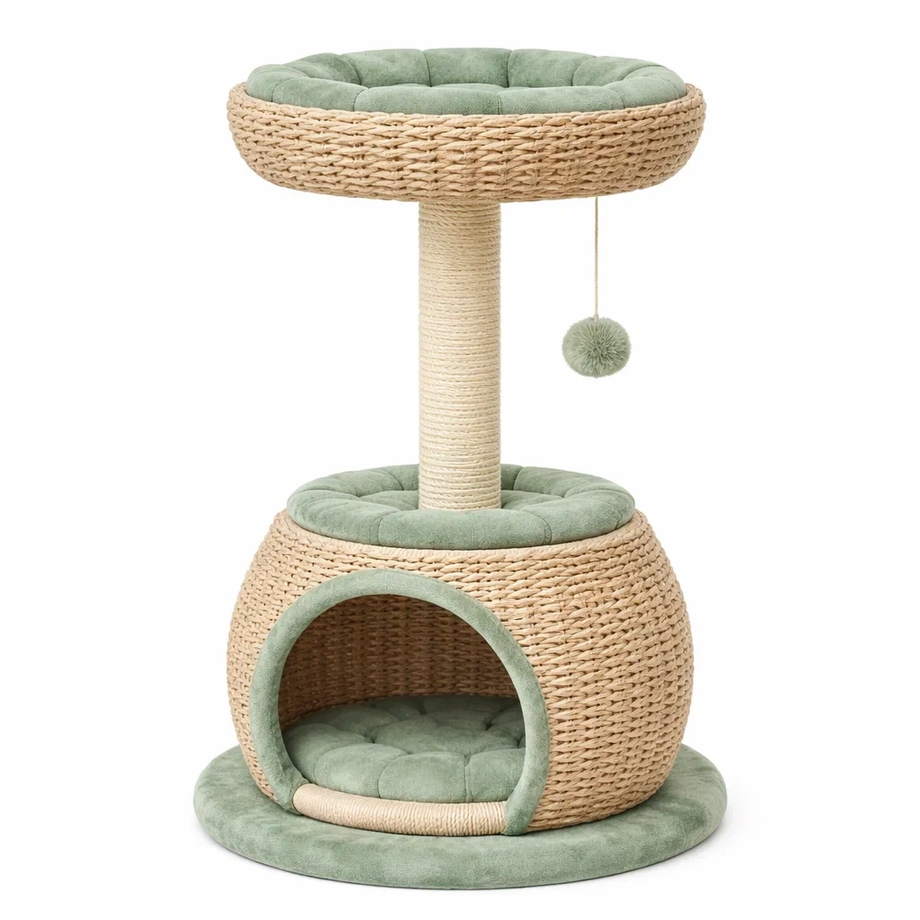Arbre à chat en osier et corde en sisal avec coussins verts