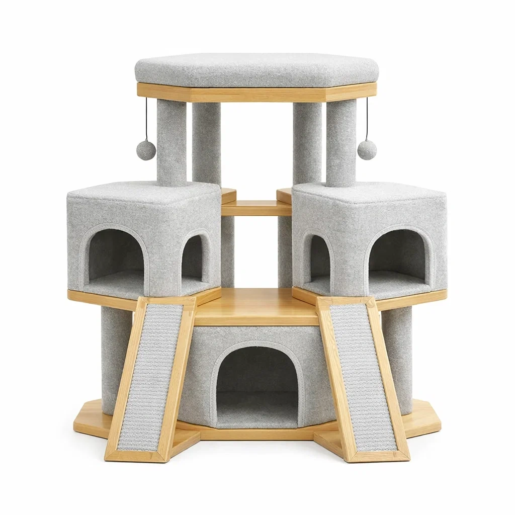 Arbre à chat avec structure hexagonale en bois, recouvert de feutre gris. Dimensions : hauteur 100 cm, largeur 60 cm, profondeur 60 cm. Comprend des cabines, des plateaux et des jouets suspendus. Intègre des griffoirs et des espaces de repos. Poids total de 15 kg. Destiné à un usage intérieur.