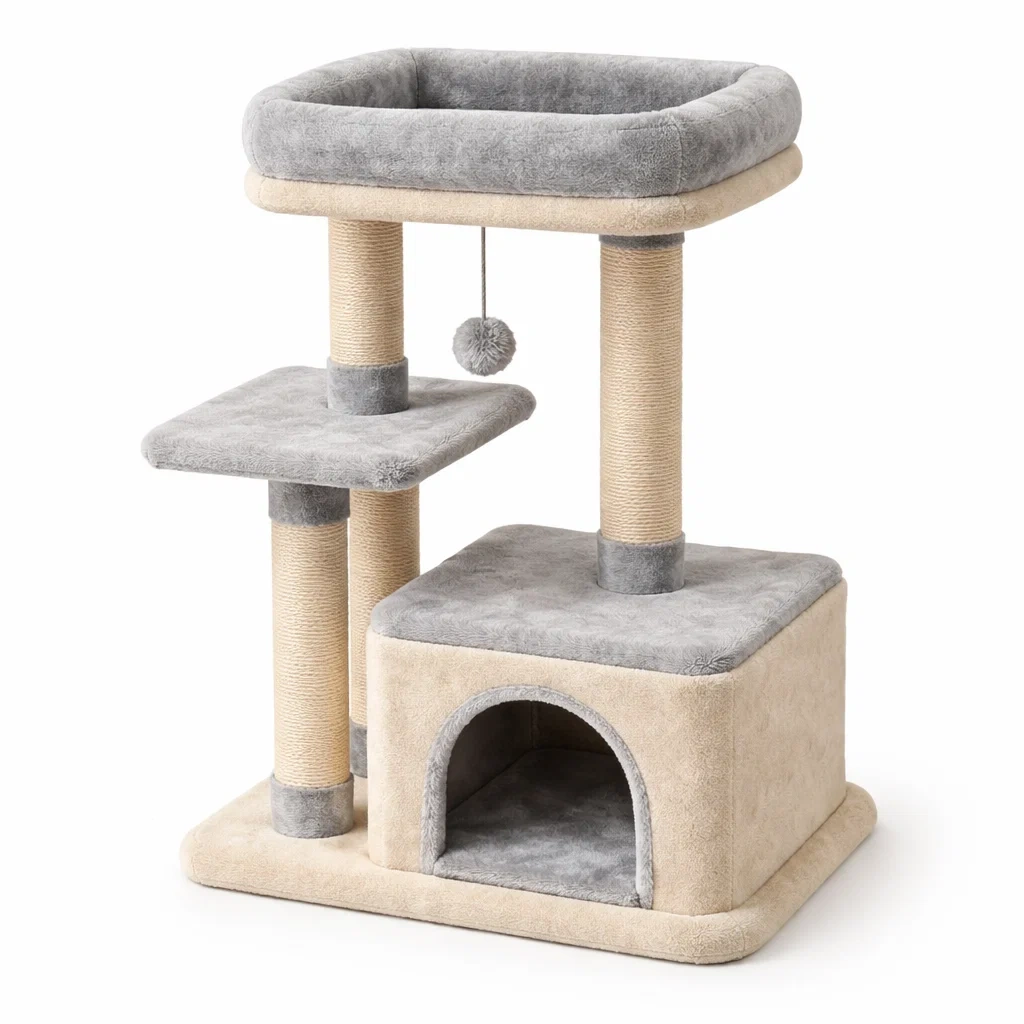 Arbre à chat comprenant une structure en MDF recouverte de peluche grise et beige. Les poteaux sont enveloppés de corde en sisal pour le grattage. Inclut un espace de repos, une cabane et un jouet suspendu.