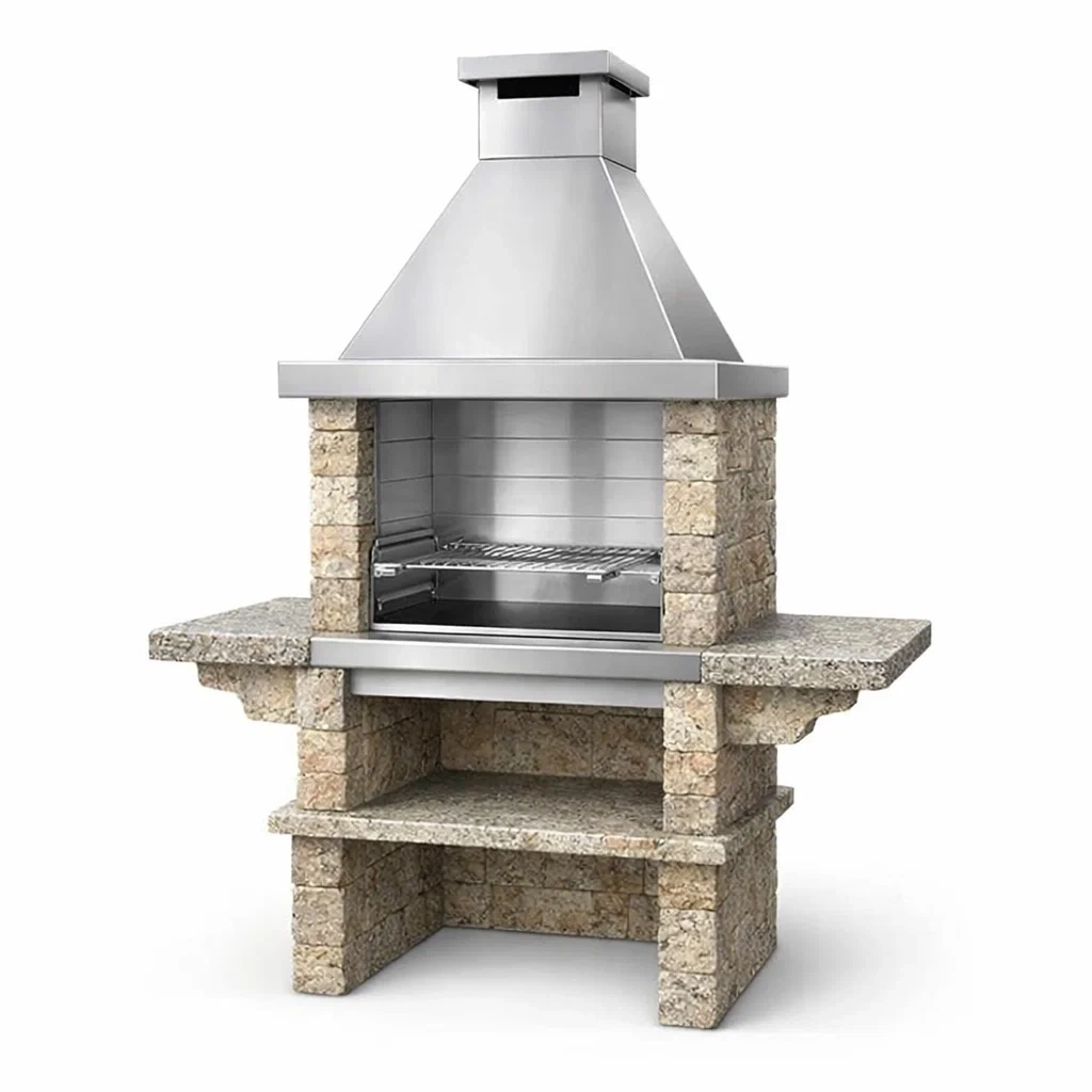 Barbecue de jardin fabriqué en granit naturel et acier inoxydable. Dimensions : 120 cm de longueur, 60 cm de largeur, 210 cm de hauteur. Poids total de 300 kg.