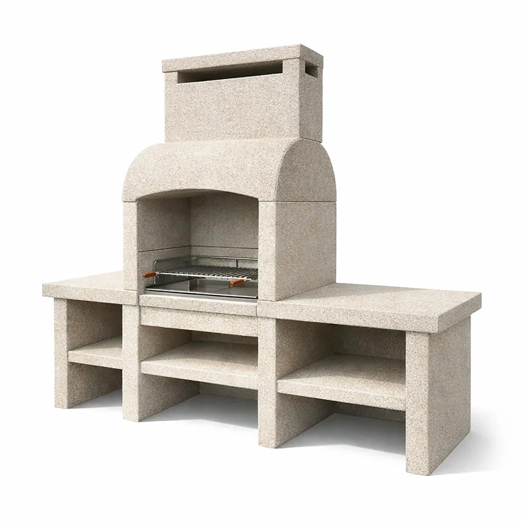 Barbecue en béton robuste avec grille en acier inoxydable pour la cuisson extérieure. Dimensions : 200 cm x 70 cm x 150 cm. Poids total de 350 kg. Couleur principale : Beige.