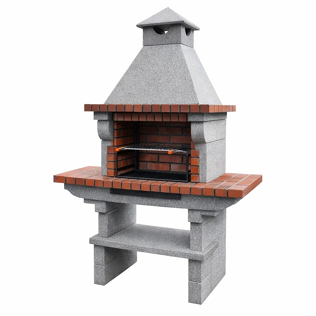 Ce barbecue est conçu pour l'extérieur, fabriqué en brique réfractaire et béton armé. Il mesure 200 cm de hauteur, 120 cm de largeur et 70 cm de profondeur, avec un poids total de 320 kg.