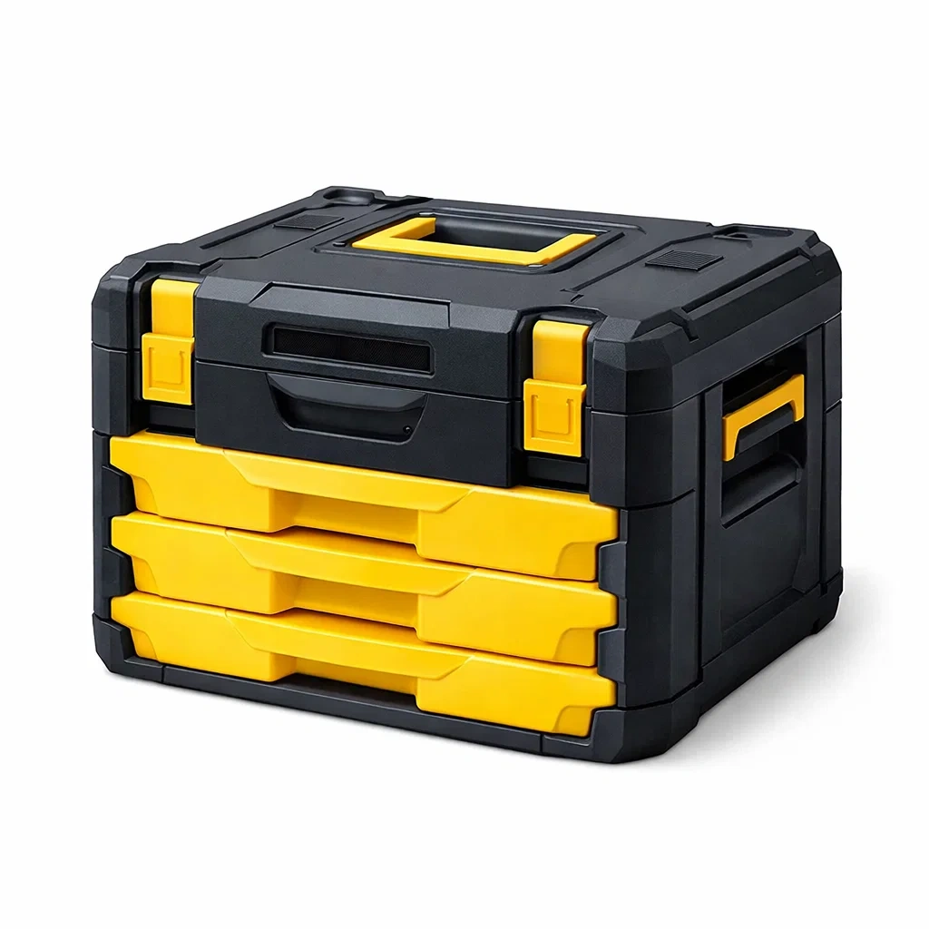 Boîte à outils avec trois tiroirs fabriquée en polypropylène. Dimensions : 40cm x 30cm x 25cm. Poids net : 5kg.
