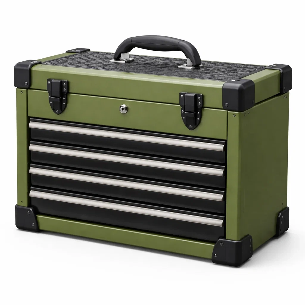 La boîte à outils est fabriquée en acier avec des coins renforcés en polypropylène. Elle est équipée de 5 tiroirs coulissants pour un rangement sécurisé des outils. La poignée de transport en plastique ABS facilite le déplacement. Les dimensions sont de 52 cm de longueur, 22 cm de largeur et 35 cm de hauteur, avec un poids de 12.5 kg.