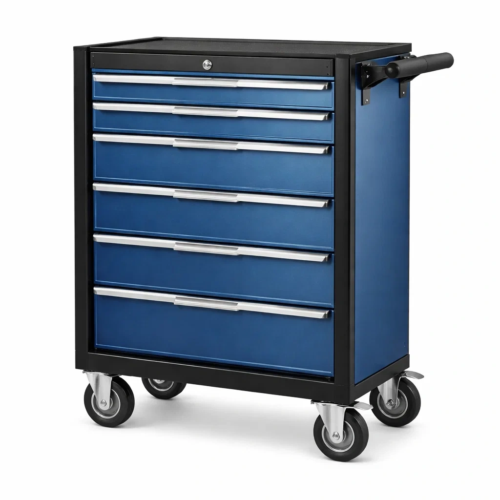 Chariot en métal robuste avec finition anti-rouille, comprenant 6 tiroirs pour une organisation efficace des outils.
