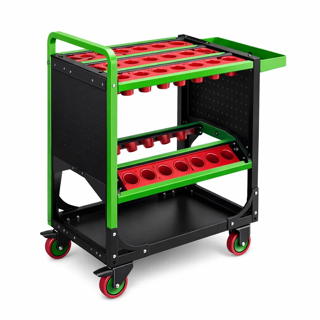 Ce chariot de service à outils est fabriqué en acier avec une finition en noir et vert. Il comprend des compartiments rouges pour le rangement d'outils. Le chariot dispose de trois niveaux et peut supporter jusqu'à 100 kg. Il est équipé de roues pivotantes en caoutchouc pour un déplacement facile.
