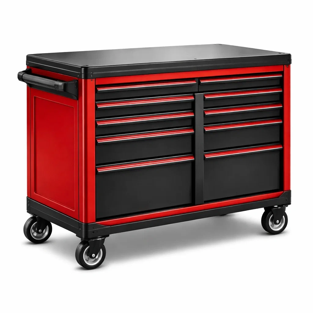 Chariot à outils mobile avec structure en acier peint en rouge et noir. Il dispose de 10 tiroirs pour le rangement des outils. La finition est en peinture époxy. Dimensions: longueur 77 cm, largeur 46 cm, hauteur 95 cm. Équipé de roues pivotantes en caoutchouc pour faciliter le déplacement et d'une poignée latérale ergonomique. Serrures de sécurité incluses pour chaque tiroir. Charge maximale recommandée: 150 kg.