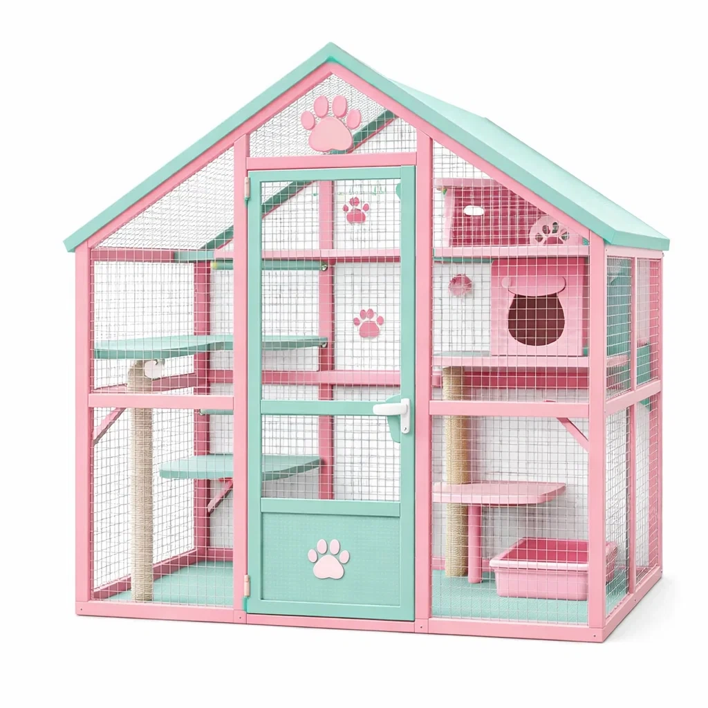 Enclos pour animaux fabriqué en métal et bois MDF avec poteaux en sisal.