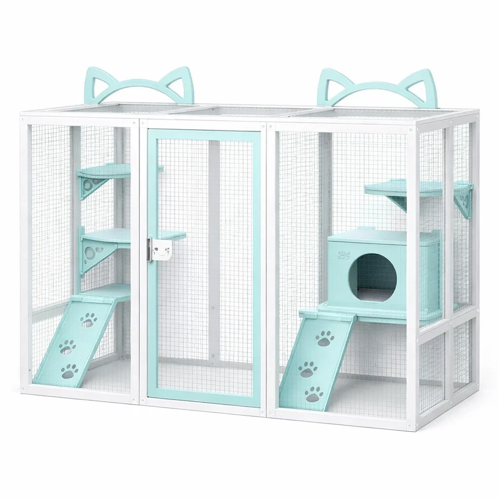 Le produit comprend : 1 enclos, 2 rampes, 2 étagères, 1 cabane.