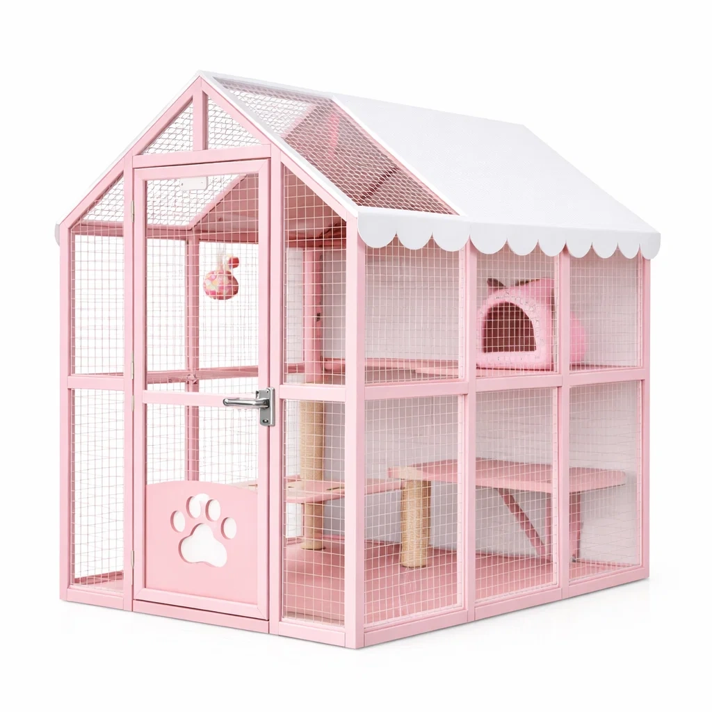 Fonctionnalités : Enclos sécurisé pour chats avec espaces pour jouer et se reposer, porte verrouillable