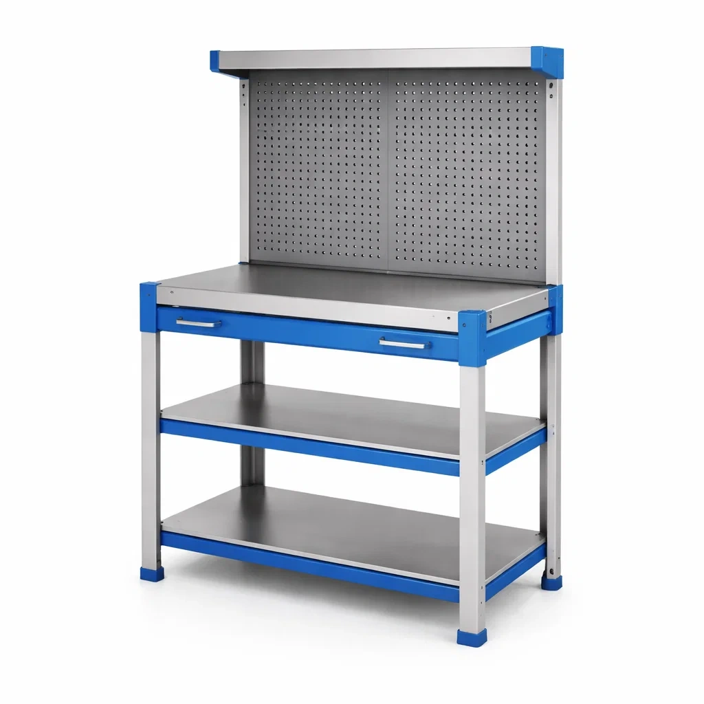 L'établi est fabriqué en acier inoxydable, résistant et durable. Il est équipé d'un tiroir intégré et de deux étagères supplémentaires pour un espace de rangement optimal. Les panneaux perforés en acier inoxydable facilitent l'organisation des outils. Charge maximale : 200 kg.