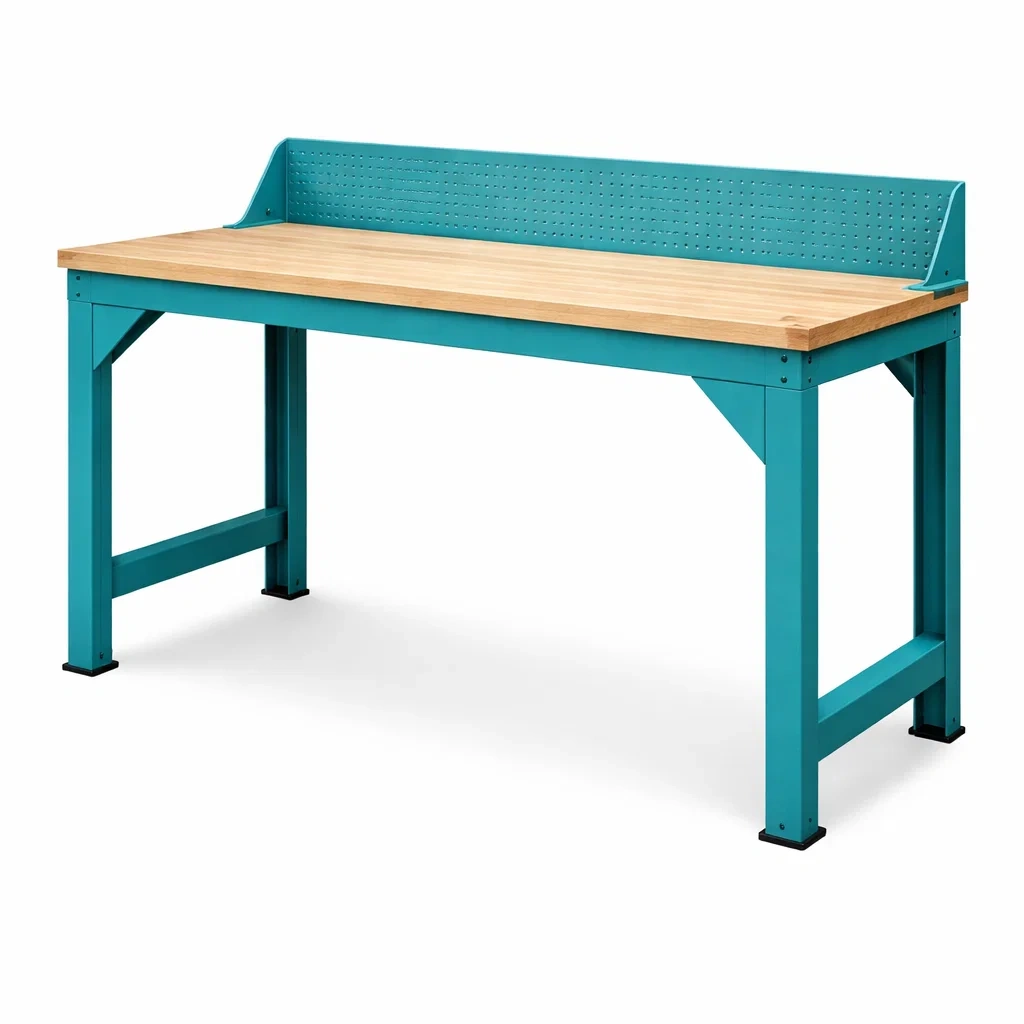 Structure principale en acier revêtu avec plateau en bois de hêtre massif. Le panneau arrière perforé offre une fonctionnalité supplémentaire pour organiser les outils.