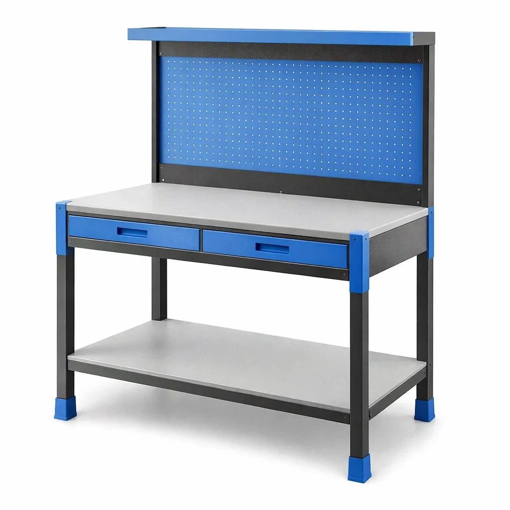 Établi en acier avec panneaux MDF et panneau perforé. La structure est principalement en acier, avec un plateau en MDF. La couleur est un mélange de Bleu, Noir et Gris. Les dimensions sont de 120 cm de longueur, 60 cm de largeur et 150 cm de hauteur. Le poids est de 25 kg et la capacité de charge est de 150 kg.