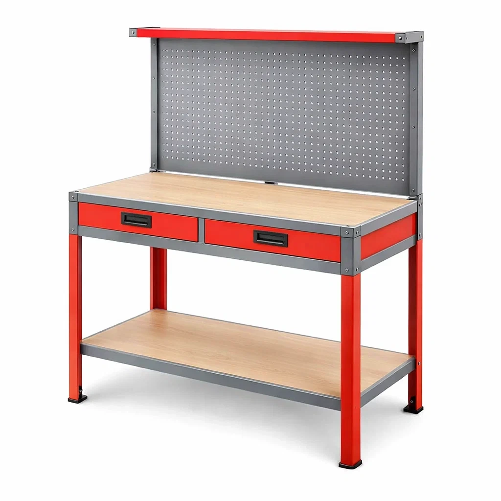 Caractéristiques : Surface de travail, deux tiroirs de rangement, panneau perforé pour outils.