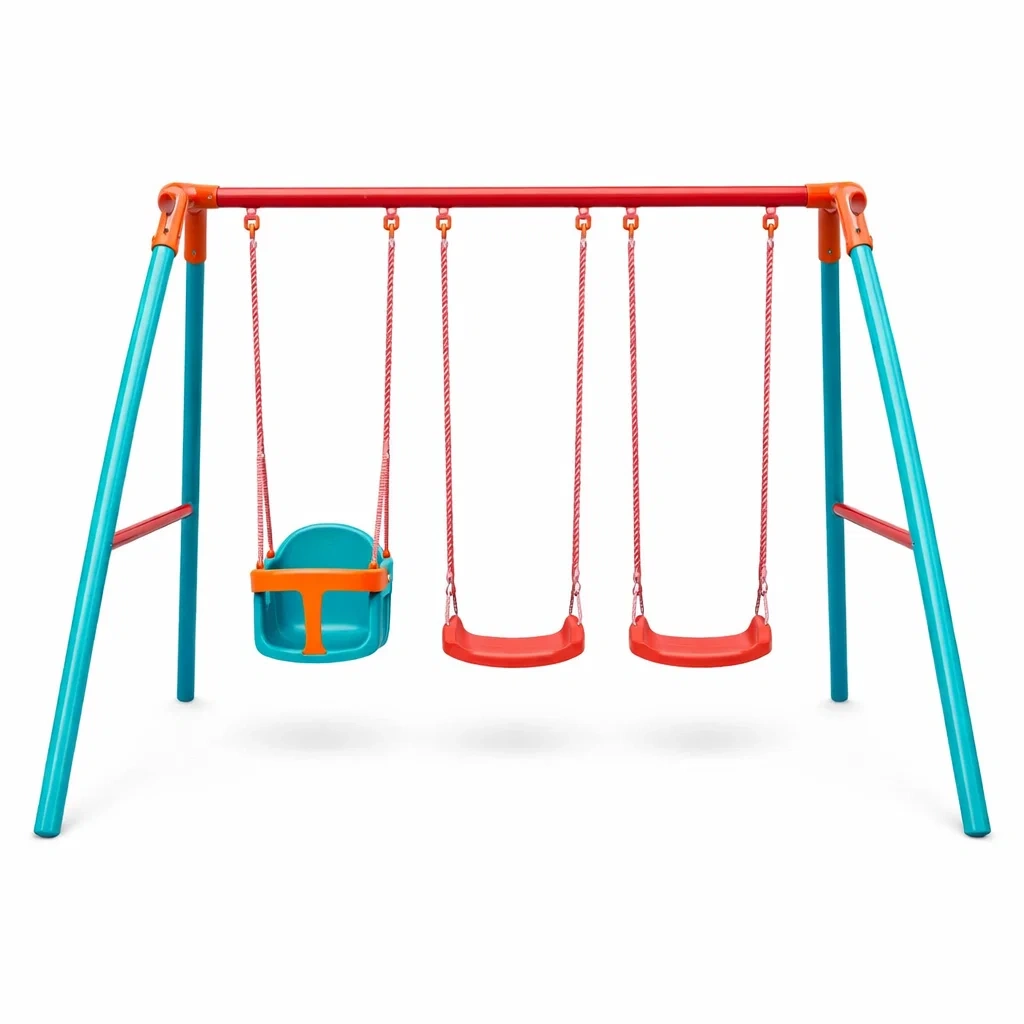 Portique de balançoire avec trois sièges, idéal pour une utilisation en extérieur.