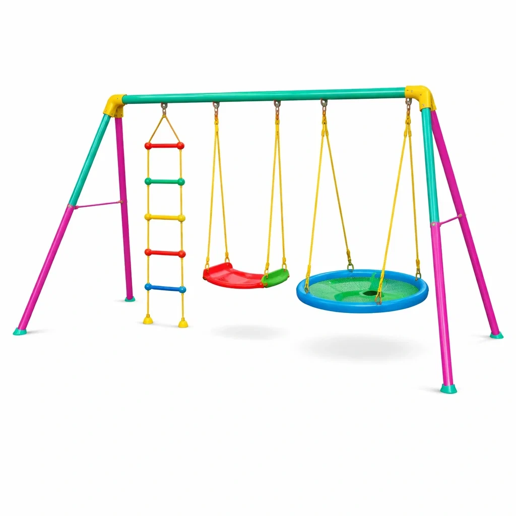 Ensemble de jeu en métal comprenant une balançoire traditionnelle, une balançoire disque et une échelle de corde.